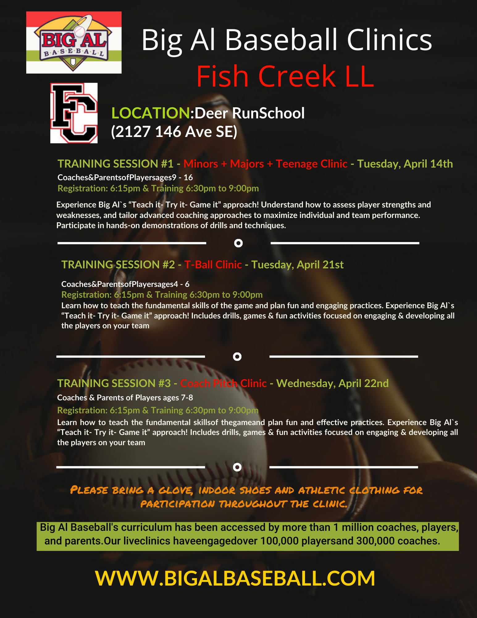CLINICS HomeAbout us Board MembersDevelopment Player Development Guide 2026 Development ProgramSpring House League T-Ball Coach Pitch Minors Majors TeenageSummer League All-StarsLocationsRegistration 2026 Coach Registration 2026 Development Registration 2026 Spring House League Registration 2025 All-Stars RegistrationEquipmentResources Coaches Resources Team Parent Reps Skills Development Field PrepSafety / Weather / PoliciesApparelClinicsLinksFAQ Fish Creek Little League PO Box 11054, Seton RPO Calgary, AB T3M 1Y6 E: registrar@fcll.ca